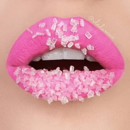 Created using a bright and bold matte liquid lipstick and cleverly placed sparkling sugar sprinkles. This is one hot lips look that’s made for the summer.